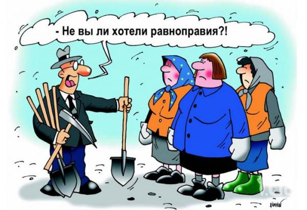 Иными словами просто так, без всяких выборов, посадить в думу не менее одной трети баб, а ещё лучше процентов 70-80. Чтоб мужики сидели себе тихо и молчали в «тряпочку». Тогда всё было бы зашибись, все были бы счастливы и довольны))). Но только они не понимают, что все на свете войны как раз происходят из-за баб. Мужики, рискуя собственной жизнью, идут отвоёвывать новые территории и ресурсы. Чтоб потом, на эту территорию, пришла его баба с детьми, и жила себе спокойно в благополучии. Разве не так я понимаю? Или есть какие-то другие мотивы? А какие «хорошие» законы курицы создают, мы и так все прекрасно знаем. Это даже не равноправие мужчин и женщин, а дискриминация мужского населения в чистом виде. Хотите в думу? Да пожалуйста! Но на общих основаниях, через выборы. Никто вам этого не запрещает.