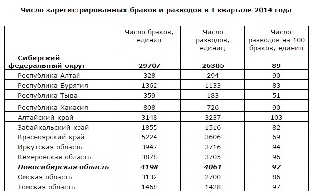 Для примера рассмотрим официальные данные Росстата по ситуации с разводами в Сибирском федеральном округе в 2014 году, – очень показательно. Особенно интригует Алтайский край – 103% разводов от числа зарегистрированных браков, – тенденция, однако.