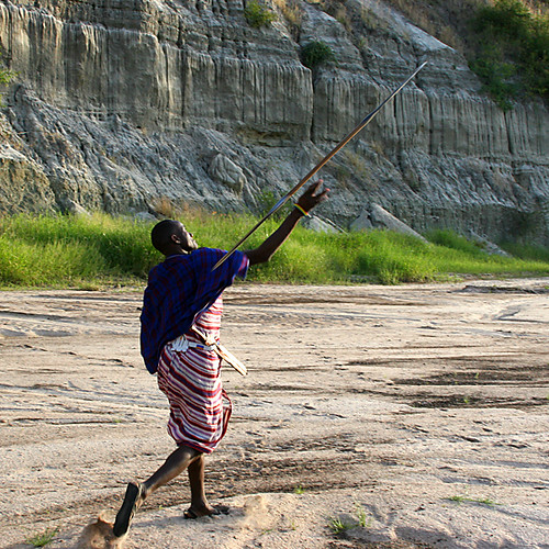 В этом детском садике они учатся лет до 7, а потом их возят в школу в ближайший город. Дикие масаи живут в национальных парках, вместе с животными, и служат своеобразными экспонатами, но многие сейчас цивилизуются, у них сельхозбизнес (кофе, фасоль, какао, специи всякие), плюс для туристов развлекушки устраивают, бижутерию всякую продают. И оружие. Я приобрел для коллекции т.н. “lion spear” – копье для охоты на львов, представляет собой что-то среднее между копьем и мечом, по идее, метательное, хотя можно и в ближнем бою рубиться. Поколотил им покрышки – штука, в принципе, неплохая.